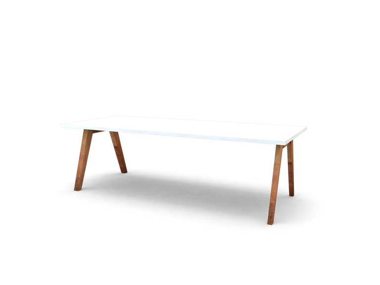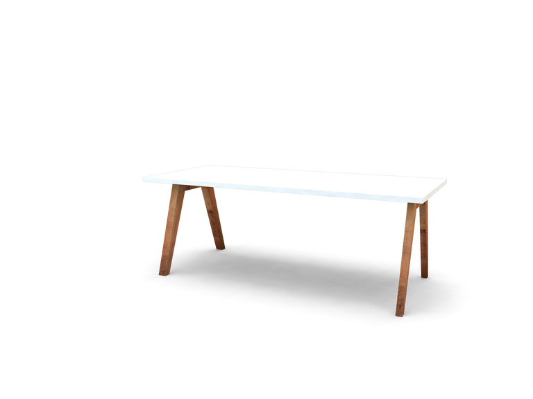Een fris wit blad complementeert de warme uitstraling van de hardhouten poten van de Trunk Top tafel. Deze multifunctionele tafel werkt voor zowel de huiskamer als het kantoor.